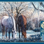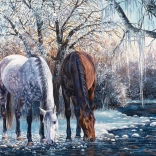 Profitez de l’atmosphère hivernale paisible avec une image de deux chevaux près d’un ruisseau gelé.