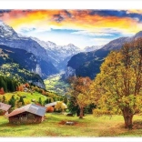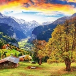 La scène d’une vallée alpine avec chalets, arbres d’automne et pics enneigés se distingue par des couleurs riches et des détails subtils – idéale à encadrer une fois assemblée.