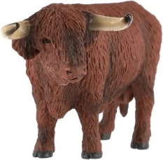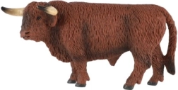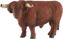 La figurine présente une texture réaliste rappelant la fourrure dense et les cornes caractéristiques du bétail des Highlands.