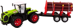 Tracteur agricole vert avec remorque à billes de bois