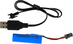Inclut une batterie Li-ion 3,7 V 500 mAh et un chargeur USB. Charge en jusqu’à 2 heures, autonomie jusqu’à 30 minutes par charge.