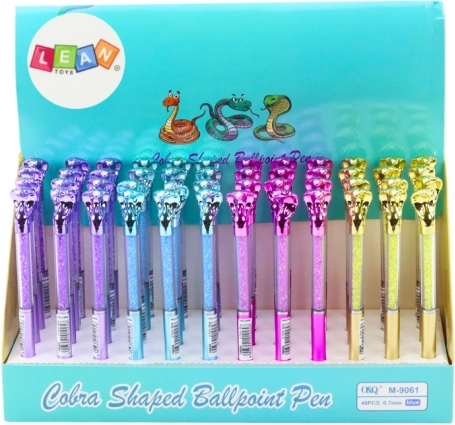 Stylo-bille élégant avec cobra et strass scintillants, recharge bleue 0,7 mm. Corps en couleurs assorties, écriture fluide, certifications CE et EN71. Idéal comme cadeau.