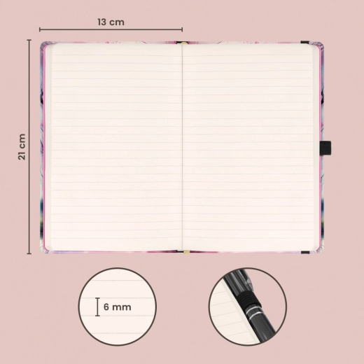 Carnet ligné NOTIQUE Sakura au format pratique 13 × 21 cm avec couverture rigide, fermeture élastique, passant pour stylo et poche intérieure. Il offre 172 pages sur un papier jaune agréable, parfait pour le journal et les notes de travail.