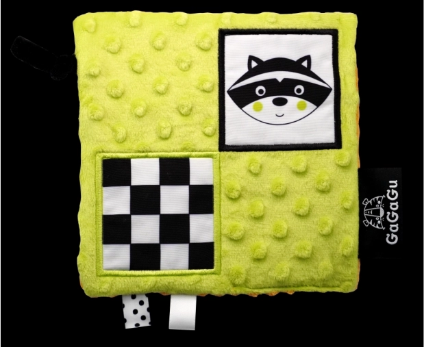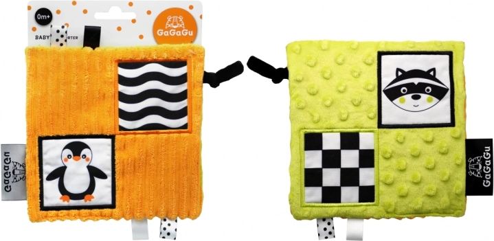 Le design réversible propose deux illustrations attrayantes — pingouin et raton laveur — ainsi qu’une multitude de détails à explorer : rubans, boucles en peluche et grande étiquette pour une prise en main facilitée. Ces éléments soutiennent la coordination œil-main et l’entraînement de la motricité fine.