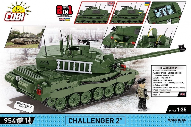 Ouvrez la trappe de la tourelle et installez à l’intérieur la figurine de tankiste fournie, avec deux options de couvre-chef (casque et béret avec emblème britannique). Choisissez parmi deux jeux d’autocollants pour assembler la version britannique ou ukrainienne. Les briques COBI sont fabriquées dans l’UE, dotées de marquages de haute qualité inaltérables et entièrement compatibles avec d’autres marques.