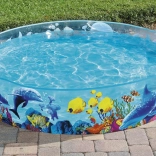 Un diamètre de 183 cm, une hauteur de 38 cm et un volume de 946 l offrent assez d’espace pour se rafraîchir et jouer entre frères et sœurs ou avec des amis.