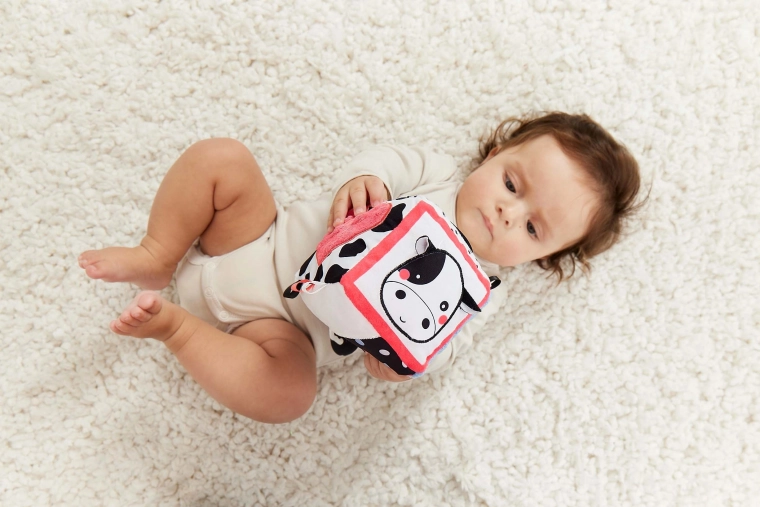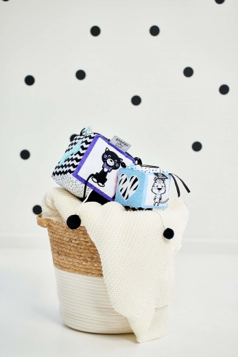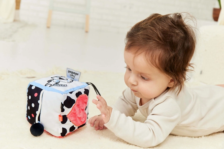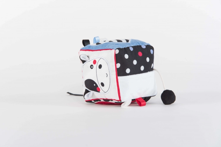 Ce cube sensoriel tout doux est conçu pour les plus petits explorateurs. Chacune des six faces offre une expérience sensorielle différente – des motifs contrastés noir et blanc avec des accents colorés jusqu’aux tissus et surfaces variés qui invitent au toucher et à la découverte. Les adorables motifs de vache et de tigre stimulent la curiosité et aident l’enfant à percevoir formes et émotions.