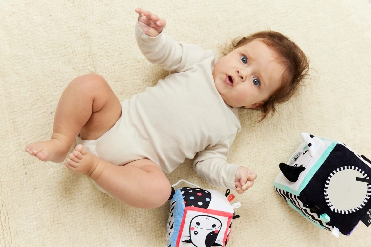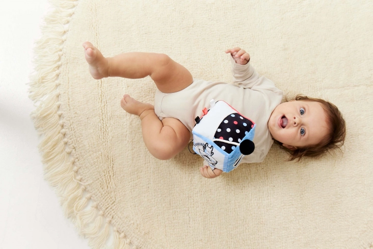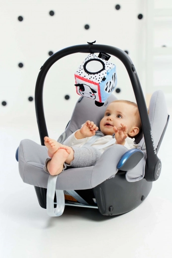 Le fort contraste des motifs noir et blanc avec des détails colorés stimule la vision et maintient l’attention de bébé pendant le jeu.