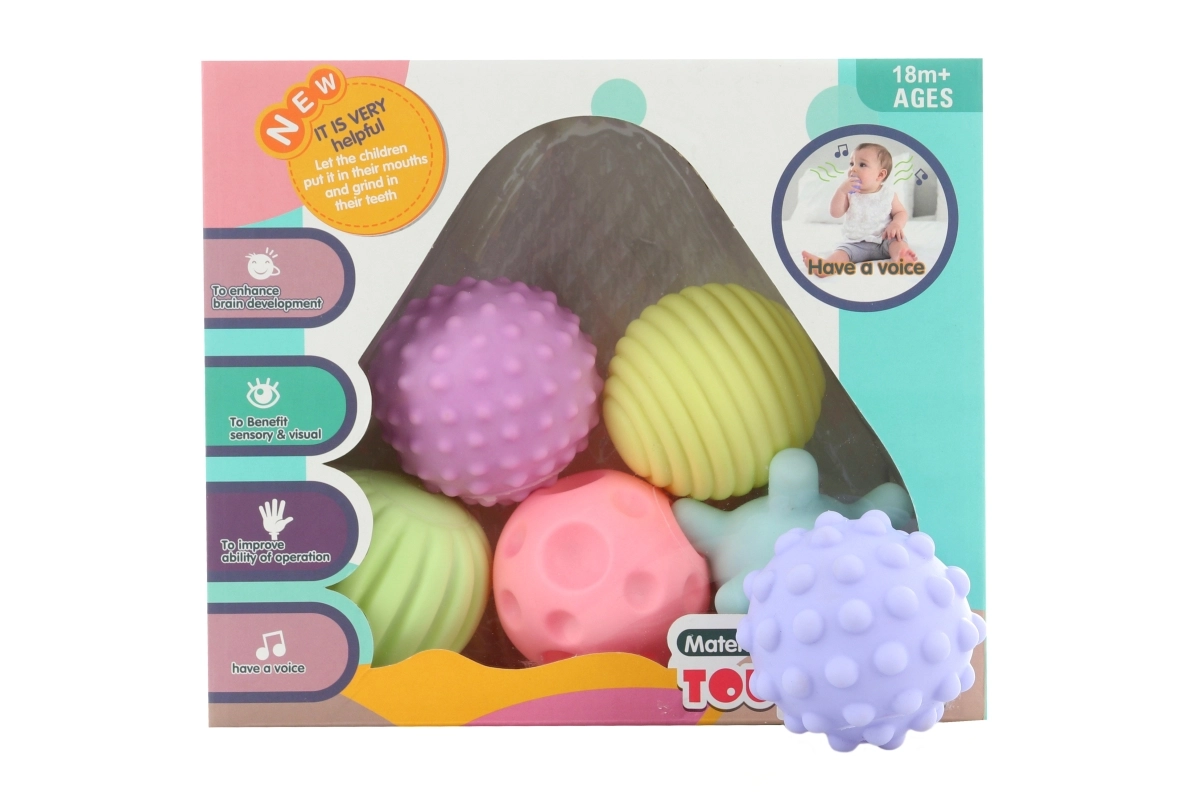 Set de balles sensorielles pour les tout-petits. Les balles sont de formes et de couleurs variées. Elles couinent lorsqu’on les presse. Emballé dans une boîte. Dimensions de l’emballage env. 21 × 18 × 7 cm. Taille des balles env. 5–6 cm. Âge 18 mois et +