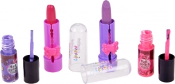 Gloss, rouges à lèvres, vernis, palette d’ombres avec applicateur et capsules autocollantes – tout assorti dans des tons ludiques rose‑violet.