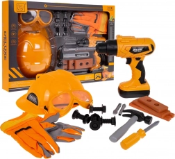Casque, gants, lunettes, marteau, tournevis, 3× plaquette, 4× accessoire, 4× vis, perceuse-visseuse, embouts interchangeables (plat, cruciforme) et foret