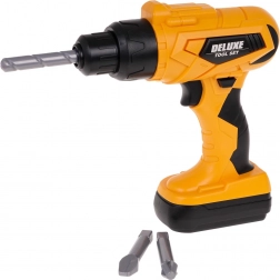 La perceuse pour enfants à 2× AA (1,5 V, non fournies) visse et dévisse réellement, possède des embouts interchangeables et une « batterie » amovible. Les effets sonores renforcent le plaisir de jeu.
