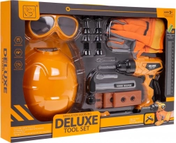 Un set d’outils pour enfants richement équipé pour les petits bricoleurs dès 3 ans comprend un casque, des lunettes, des gants, un marteau, un tournevis, des vis et des plaquettes ainsi qu’une perceuse-visseuse à piles avec sons fonctionnant avec 2× AA (non incluses). 20 pièces en plastique sûr qui stimulent l’imagination et la motricité fine.