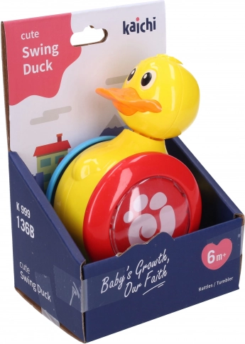 Canard coloré sur roulettes qui attire l'attention des enfants grâce à son mouvement basculant et aux sons cliquetants des petites billes.