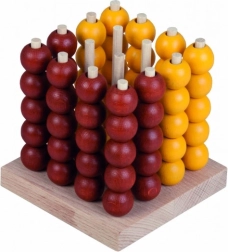 Le jeu Morpion 3D est équipé de 64 billes en bois de deux couleurs et d'un plateau de jeu avec 16 tiges. Les joueurs s'efforcent tour à tour d'enfiler les billes de leur couleur sur les tiges afin de créer une rangée de quatre billes dans n'importe quelle direction.