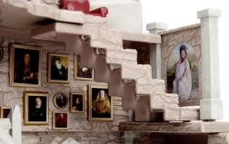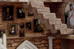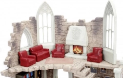Petit modèle de pièce avec pierre antique et fenêtres en arc gothique. Les fauteuils rouges autour de la cheminée soulignent le style gothique.