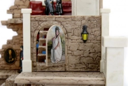 Miniature en pierre du château avec piliers et une petite lampe extérieure, idéale pour exposition ou jeu.