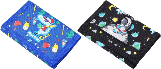 Pratique portefeuille en tissu avec fermeture Velcro au format compact 12,5 × 8 cm, idéal pour les enfants et les écoliers. Disponible en 2 motifs attrayants – bleu avec dinosaure et noir avec astronaute. Léger, résistant et facile à glisser dans une poche ou un cartable.