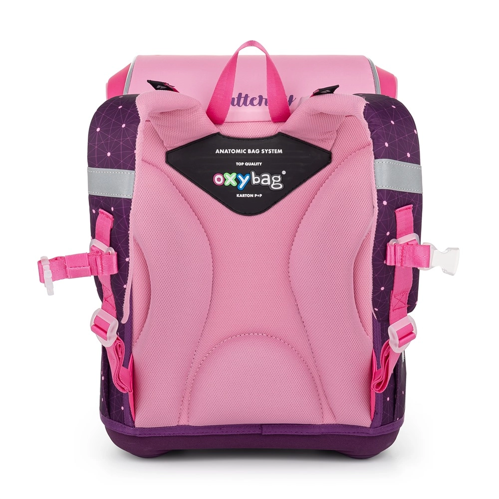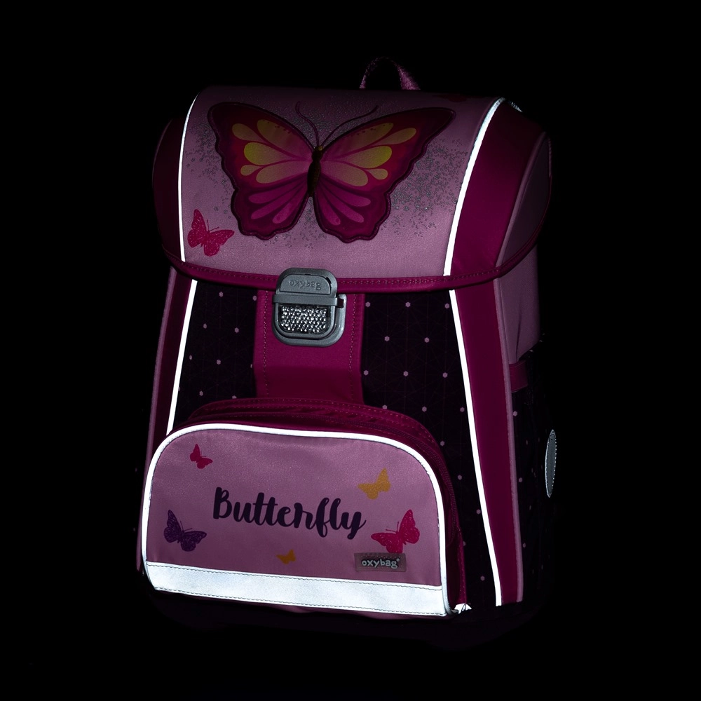 Cartable scolaire stylé à motif papillons alliant design attrayant et priorité au port sain. Un dos anatomique avec rembourrage respirant et des bretelles larges rembourrées garantissent le confort au quotidien. Le fond rigide et le renfort intérieur maintiennent la forme du sac et protègent le contenu contre le renversement et la dispersion.
