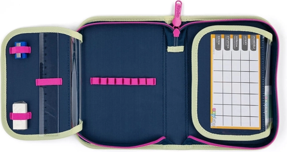 Trousse à un seul compartiment avec deux rabats intérieurs offrant une excellente organisation des fournitures scolaires. Grâce à 25 bandes élastiques, vous aurez crayons, stylos, gomme et règle toujours à leur place. Les films transparents sur les rabats sont parfaits pour l’emploi du temps ou des notes.