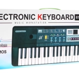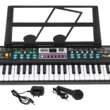 Contenu de la boîte: clavier, adaptateur secteur, microphone, pupitre. Alimentation sur secteur (adaptateur inclus) ou 6× AA 1,5 V (non incluses).