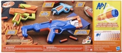 Le pack comprend trois blasters différents dans les couleurs principales bleu et orange, offrant différents styles de jeu.