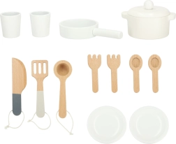 L'ensemble comprend des poêles, casseroles, assiettes et autres ustensiles, permettant aux enfants de jouer à cuisiner de manière réaliste.