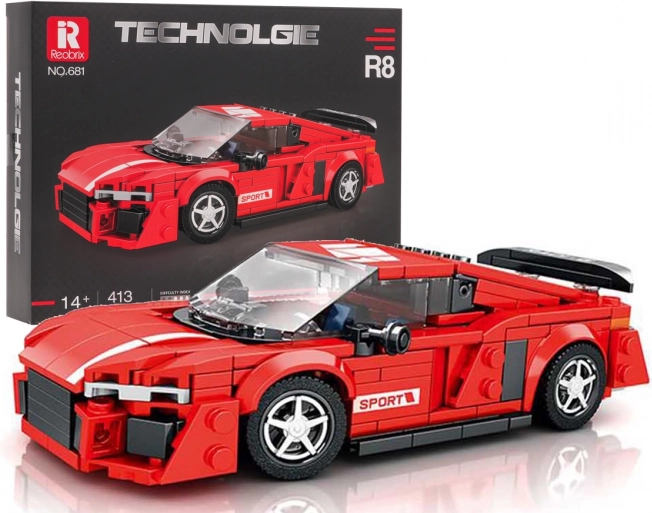 Kit de construction voiture de sport 413 pièces avec fenêtres transparentes, autocollants et manuel illustré. Convient dès 14 ans. Détails réalistes et assemblage facile.