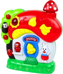 La maison interactive est un excellent choix pour le jeu quotidien comme pour l’apaisement du soir. Les sons de la nature calment le bébé et l’aident à s’endormir, tandis que les animaux émettent leurs sons caractéristiques. Un double appui déclenche le fond musical, et les perceptions visuelles sont stimulées par un petit champignon lumineux et une lumière sur le toit.
