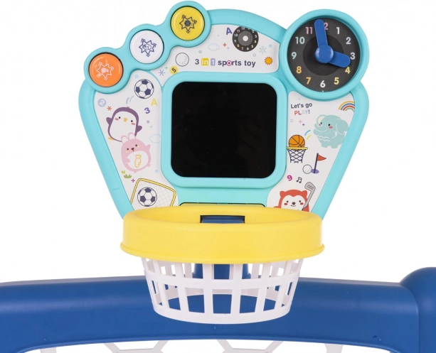 Set interactif football, basket et golf 3 en 1, pour enfants à partir de 18 mois. Trois boutons sur le panneau permettent de passer d’un mode à l’autre. Le jouet fonctionne avec 3 piles AA 1,5 V (non incluses). .Modes du jouet : . - Bouton FUN : l’enfant écoute les consignes puis les suit, .- Bouton MOUVEMENT : lance des animations sur le panneau avec sons et musique, .- Bouton ARRÊT : le tout-petit contrôle les résultats affichés sur le panneau. .Fonctions du jouet : . - convient aux enfants de plus de 18 mois, .- 3 jeux au choix : golf, basket, tir sur boîte avec balle, différentes possibilités de jeu, .- horloge avec aiguilles mobiles pour apprendre l’heure, .- engrenages pour exercer la précision, .- carnets à insérer, .- panneau interactif avec effets sonores et lumineux. |
