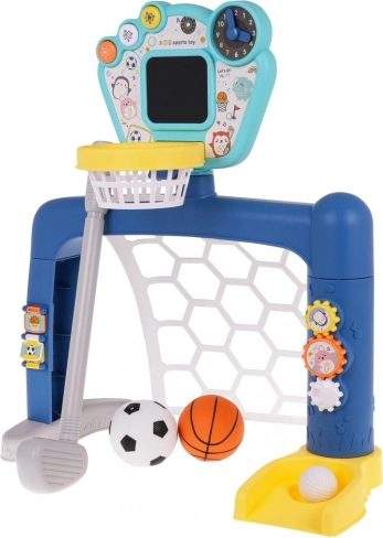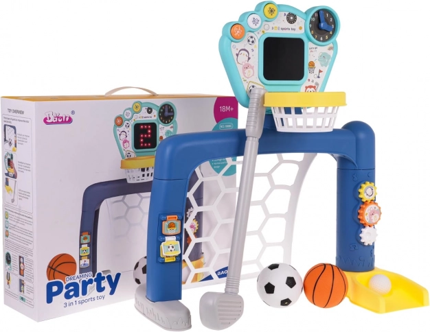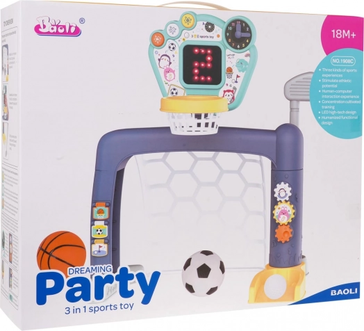 but de football avec panier de basket, .- ballon de basket en caoutchouc, .- ballon de football en caoutchouc, .- balle de golf en caoutchouc, .- club de golf, .- panneau interactif avec affichage des points et des pastilles, .- manuel d’utilisation, .- boîtier pour les balles. . |