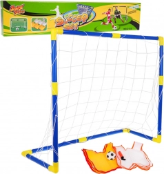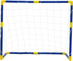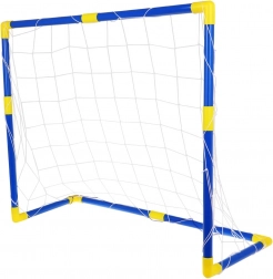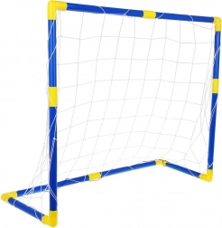 Les tubes bleus avec raccords jaunes s’emboîtent facilement pour former un cadre stable. Le filet est solidement fixé autour de la structure, ce qui permet d’installer et de déplacer le but en un rien de temps.