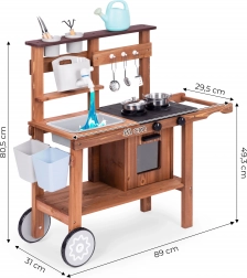 Des détails astucieux comme le robinet fonctionnel, les portes ouvrantes du placard ou du « four », et les roues à bande de roulement en caoutchouc pour un déplacement en douceur font de cette cuisine un poste de jeu apprécié. Le riche ensemble d’accessoires (casserole, poêle, louche, passoire, spatule, arrosoir et outils de jardin) stimule l’imagination et favorise le jeu autonome.