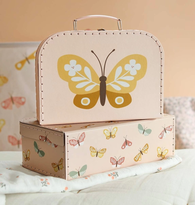 Adorable set de deux valisettes en carton au motif de papillons, pour le plaisir des enfants comme des adultes. Idéales pour ranger les jouets, le matériel créatif ou de petits objets dans la chambre d’enfant et pour les voyages. Fabriquées en carton résistant avec piqûres en polyester, équipées d’une poignée en métal et d’un fermoir sécurisé pour un transport facile.