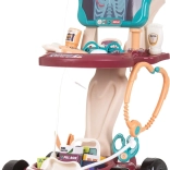 Le chariot est clairement organisé avec des étagères pour les instruments et comprend un large ensemble d’accessoires : stéthoscope, perfusion, masque à oxygène avec bouteille et d’autres outils indispensables aux petits médecins. Grâce aux roulettes et à ses dimensions compactes 58 × 42,5 × 32 cm, il est facile à déplacer et stable pendant le jeu.