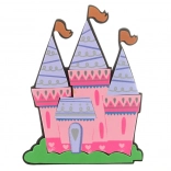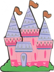 Une découpe en mousse colorée d’un château à trois tourelles apporte une atmosphère magique à la pièce.