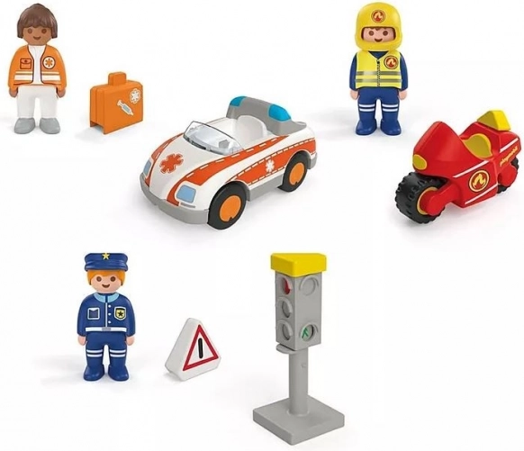 - Docteure avec trousse de premiers soins, policier avec panneau, pompier à moto, voiture de secours avec crochet de remorquage, feu tricolore, signalisation routière