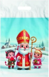 Sac plastique décoratif imprimé avec Saint‑Nicolas, un ange et un diablotin, idéal pour emballer les cadeaux de la Saint‑Nicolas. La taille 29×46 cm offre suffisamment d’espace pour les friandises, les jouets et les cadeaux plus grands, et séduit par son motif joyeux et coloré.