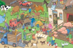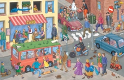Des scènes domestiques renversées et débordantes de détails. Les enfants chercheront ce qui cloche et inventeront leurs propres histoires.