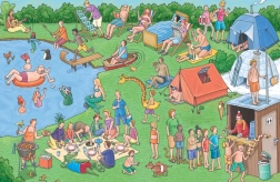 Camping, baignades et jeux d’été au bord de l’étang – des scènes colorées qui invitent les enfants à inventer leurs propres histoires.