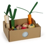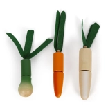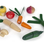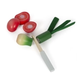 - Comprend un couteau en bois, une tomate, un concombre, une carotte, une pomme, une banane, un champignon, un poivron, un oignon, un poireau, une orange, une pastèque, une poire et un radis (panais).