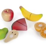 Les aliments sont reliés par du velcro, ce qui permet de les « couper » avec le couteau en bois fourni. Les enfants peuvent ainsi jouer à cuisiner comme les adultes.