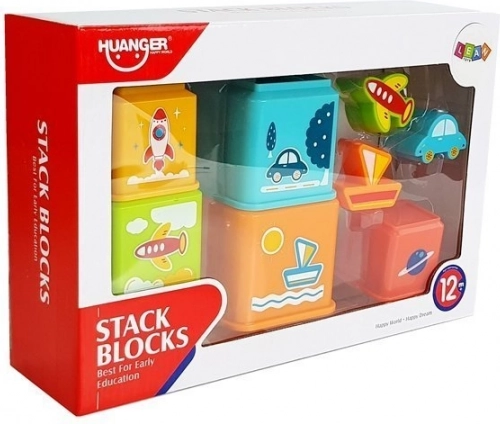 Ensemble coloré de gobelets carrés à motifs de véhicules pour un apprentissage ludique. Les enfants exercent la motricité fine, la coordination œil-main, la pensée logique ainsi que la reconnaissance des couleurs, des formes et des chiffres. Chaque gobelet possède une ouverture de tri (trieur) pour associer le bon véhicule et permet de construire une haute pyramide.