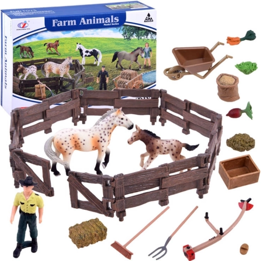 Ce set richement équipé transporte les enfants dans l’univers de la ferme. Il comprend deux figurines de chevaux fidèlement reproduites (jument et poulain), un fermier, un enclos et de nombreux accessoires comme une brouette, une fourche, un râteau, une auge et de la nourriture. Les détails réalistes, de la texture du « bois » sur la barrière à la robe des chevaux, stimulent l’imagination et des heures de jeu.