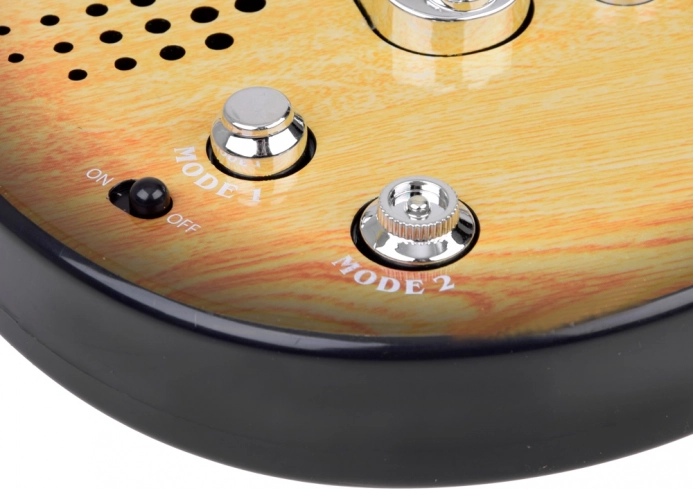 - Bouton de mode (MODE 2), grand bouton argenté pour la sélection des mélodies, interrupteur On/Off