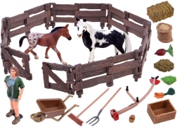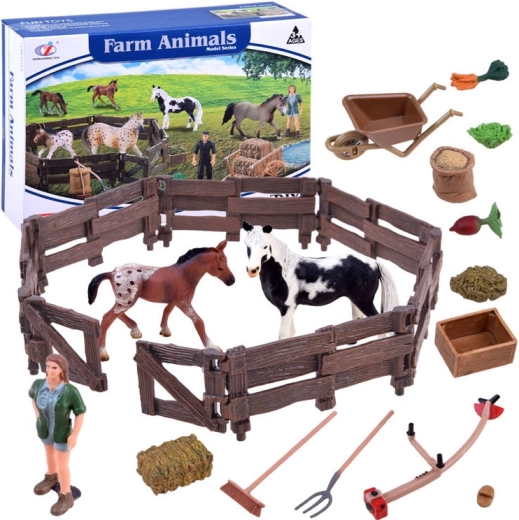 Ce set complet apporte sur votre table une scène entière de la vie à la ferme. Vous y trouverez un grand cheval, un adorable poulain, une figurine de fermier et une série d’outils et d’accessoires pour le soin des animaux. Des proportions réalistes, des couleurs expressives et des détails précis en font à la fois un excellent jouet et un support éducatif.