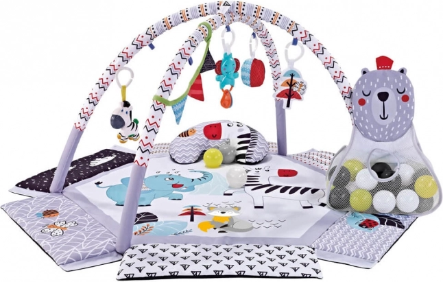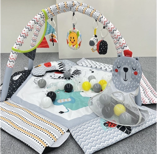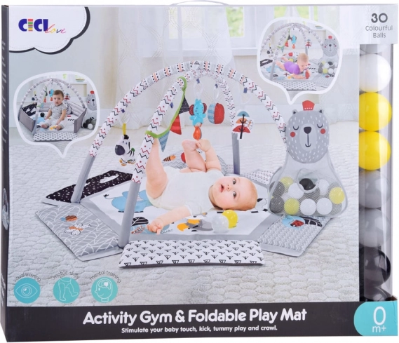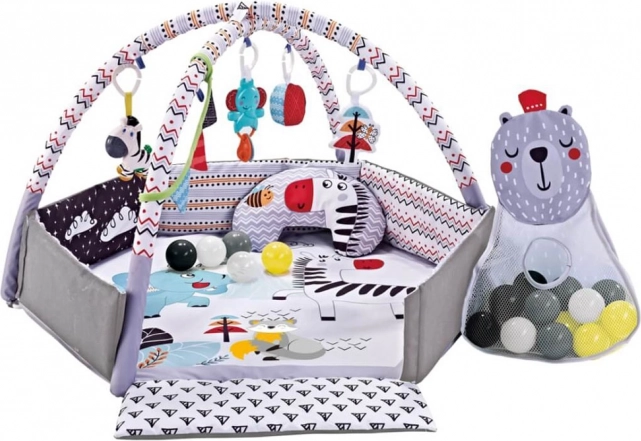 Bébé peut s’allonger sur le dos et attraper les jouets, développant ainsi ses capacités motrices et renforçant les muscles du dos. En refermant le tapis, vous obtenez un parc adapté aux enfants assis ou qui rampent, et les balles incluses décuplent le plaisir.