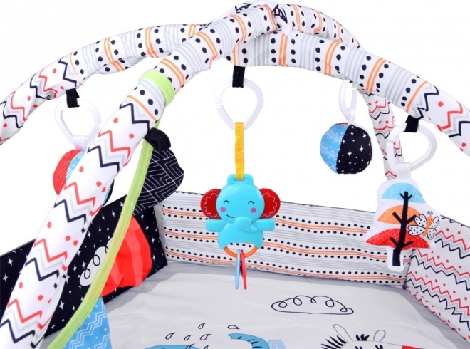 Le set comprend de nombreux éléments ludiques variés, dont des balles en peluche, un petit arbre, un zèbre et un éléphanteau en plastique à fixer sur l’arche, ainsi qu’un filet de rangement pour les balles.