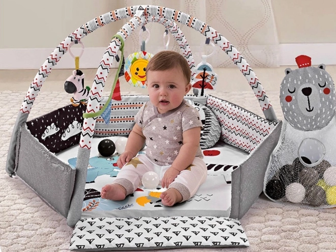 Offrez à votre enfant un espace d’éveil et de jeu avec ce tapis multifonction qui sert de transat avec petit coussin et arches courbées, de parc de jeu et de zone à balles. L’ensemble accompagne les différentes phases de développement, notamment le rampement puis la position assise.