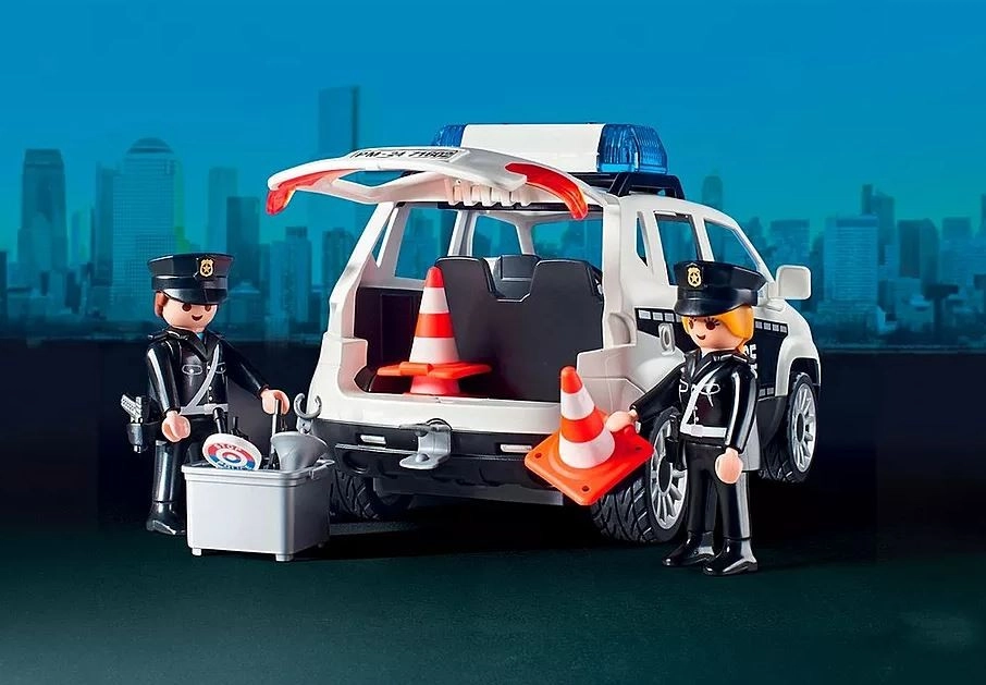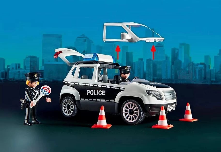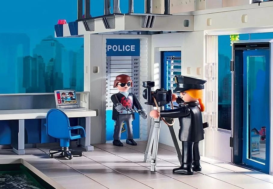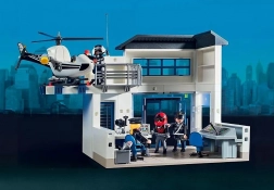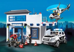 Au centre de commandement du grand poste de police, un appel d’urgence a été reçu. Le bandit recherché s’enfuit en quad ! La grande porte de la station est déjà ouverte et la poursuite sirènes hurlantes commence. Une fois le suspect arrêté, ses empreintes digitales sont relevées et le criminel est identifié. Cependant, le prisonnier parvient à s’évader des deux cellules par un trou dans le mur. Poste de police avec espace pour une voiture de police (non incluse) et une aire d’atterrissage pour hélicoptère sur le toit.